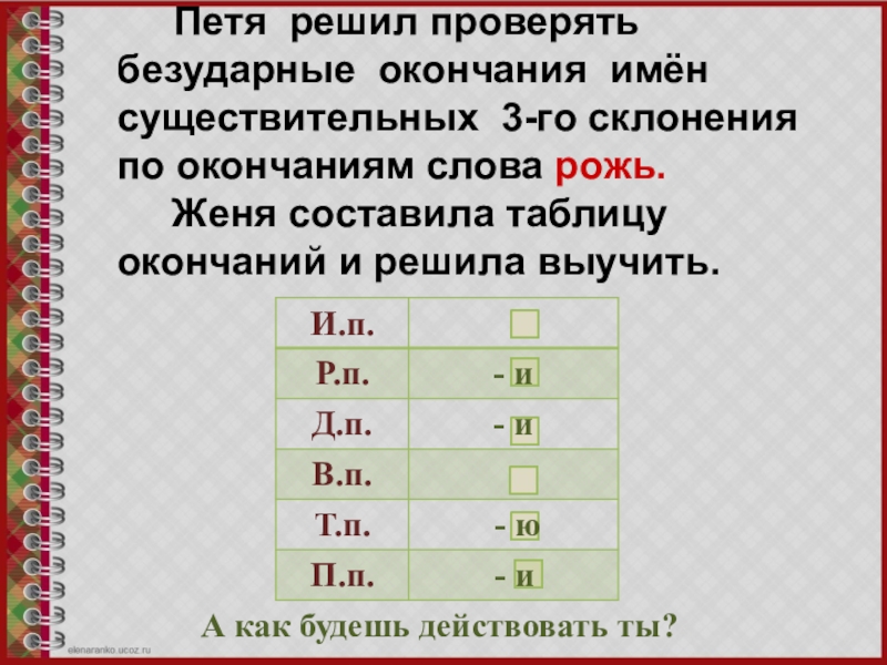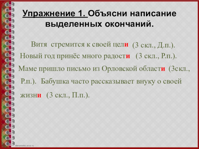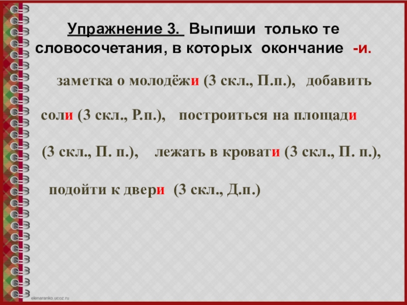 зимует – зимы, лето (ср.р.), майке (1 скл., П.п.), отвечай – ответ, в печке (1 скл., П.п.),