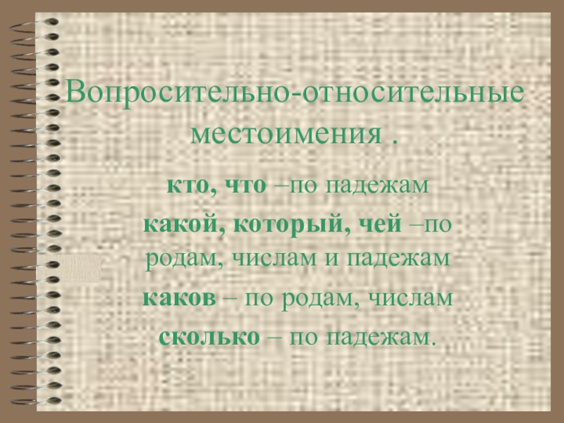 Вопросительно-относительные местоимения .кто, что –по падежамкакой, который, чей –по родам, числам и падежамкаков – по родам, числамсколько –