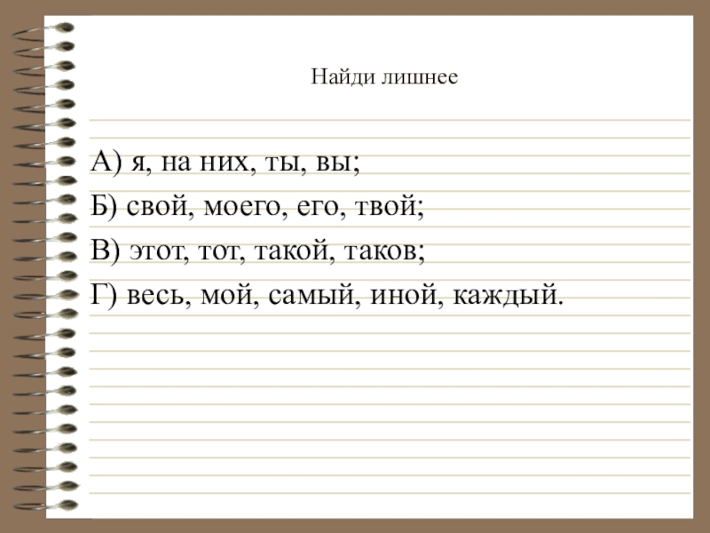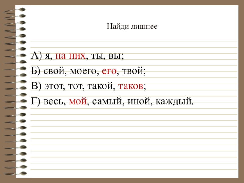 Найди лишнееА) я, на них, ты, вы;Б) свой, моего, его, твой;В) этот, тот, такой, таков;Г) весь, мой,