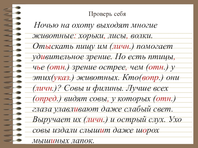 волки. Отыскать пищу им (личн.) помогает удивительное зрение. Но есть птицы, чье (отн.) зрение острее, чем (отн.) у этих(указ.) животных. Кто(вопр.) они (личн.)? Совы и филины. Лучше всех(опред.) видят совы, у которых (отн.) глаза улавливают даже слабый свет. Выручает их (личн.) и острый слух. Ухо совы издали слышит даже шорох мышиных лапок.