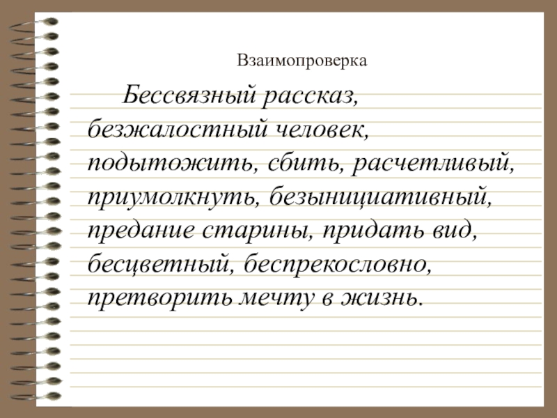 Взаимопроверка Бессвязный рассказ, безжалостный человек, подытожить, сбить, расчетливый, приумолкнуть, безынициативный, предание старины, придать вид, бесцветный, беспрекословно, претворить мечту в жизнь.