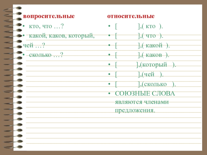 вопросительныекто, что …?какой, каков, который, чей …?сколько …?относительные[      ],( кто ).[