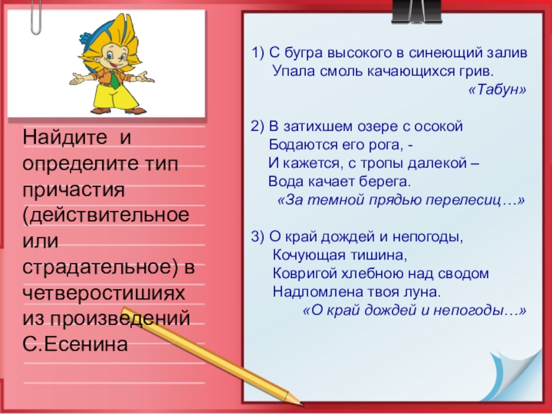 Найдите и определите тип причастия (действительное или страдательное) в четверостишиях из произведений С.Есенина