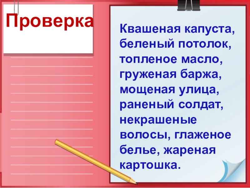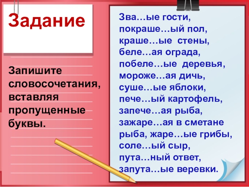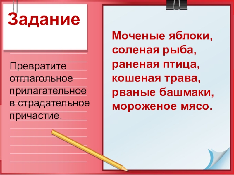 Образец: печенная в золе рыба – печеная рыба, позолоченное кольцо — золоченое кольцо.