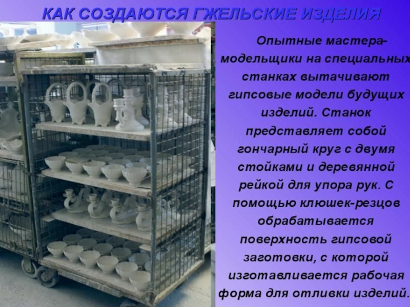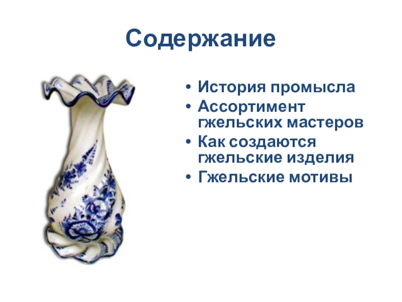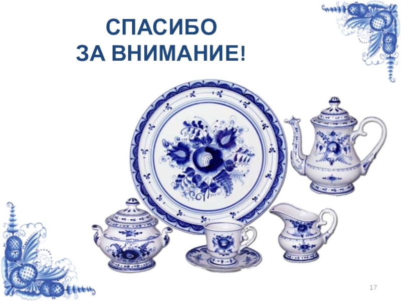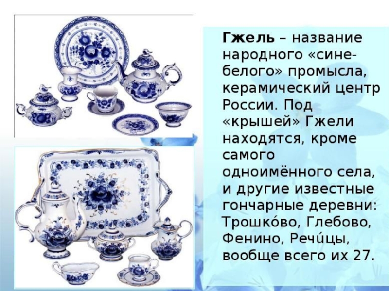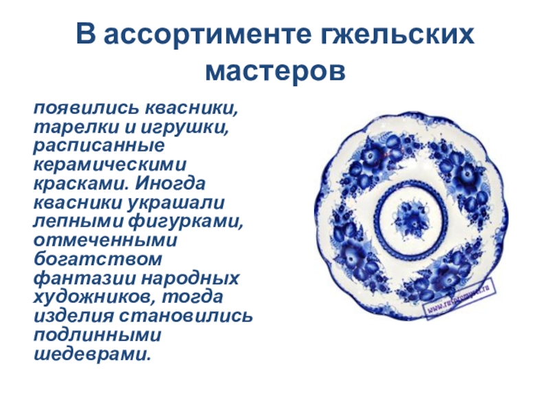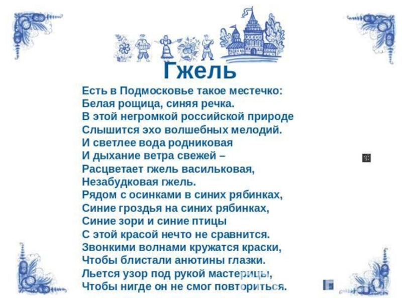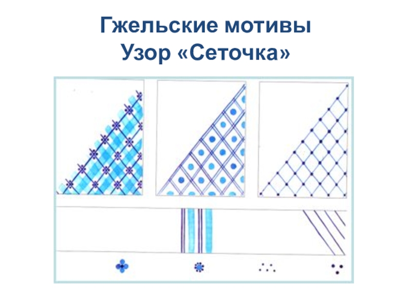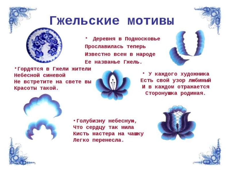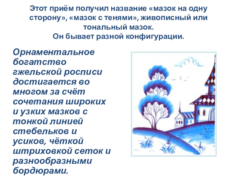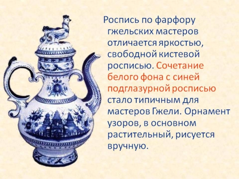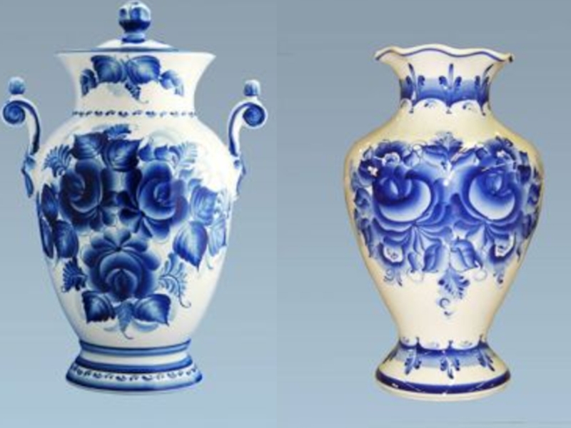 Орнаментальное богатство гжельской росписи достигается во многом за счёт сочетания широких и узких мазков с тонкой линией стебельков и усиков, чёткой штриховкой сеток и разнообразными бордюрами.