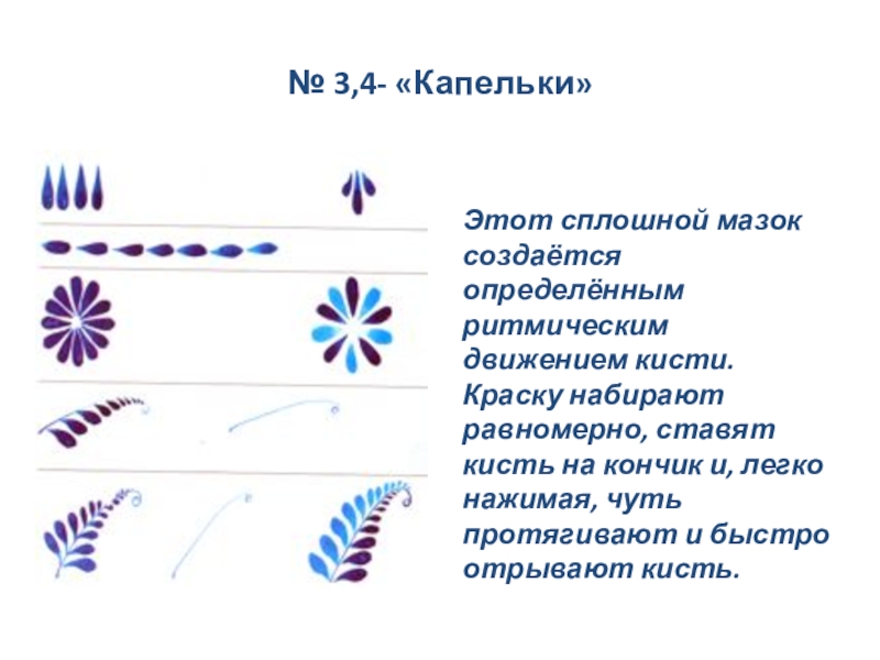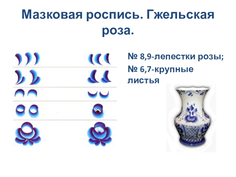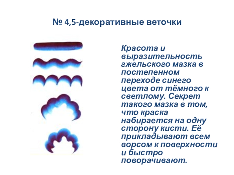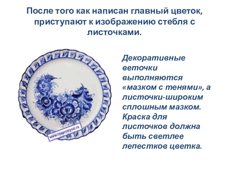 Декоративные веточки выполняются «мазком с тенями», а листочки-широким сплошным мазком. Краска для листочков должна быть светлее лепестков цветка.