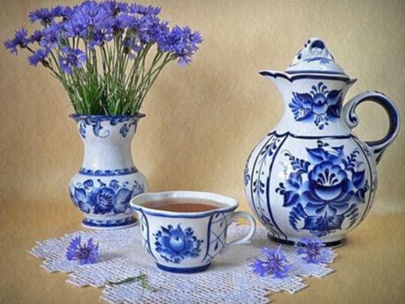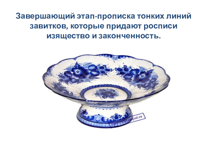 Фарфоровые изделия, прошедшие обжиг, живописец расписывает окисью кобальта. Традиционная роспись фарфора - выполненные от руки растительные и геометрические орнаменты, нанесенные быстрыми, сочными мазками кисти. Исполнение росписи вручную позволяет создавать множество вариантов одного и того же декоративного мотива фарфорового изделия.