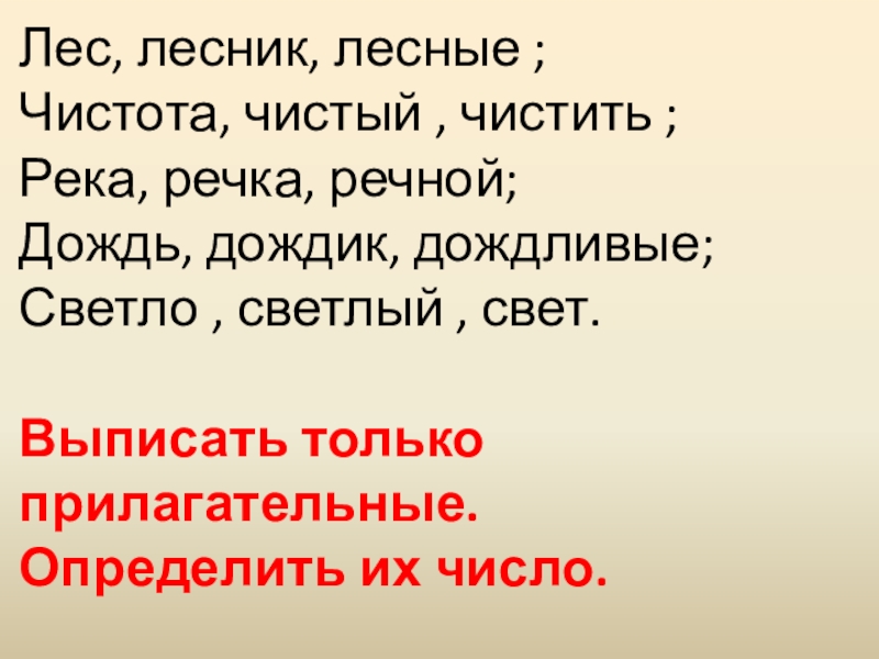 Лес, лесник, лесные ; Чистота, чистый , чистить ; Река, речка, речной; Дождь, дождик, дождливые; Светло ,