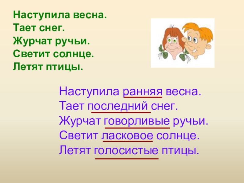 Наступила весна.Тает снег.Журчат ручьи.Светит солнце.Летят птицы.Наступила ранняя весна.Тает последний снег.Журчат говорливые ручьи.Светит ласковое солнце.Летят голосистые птицы.