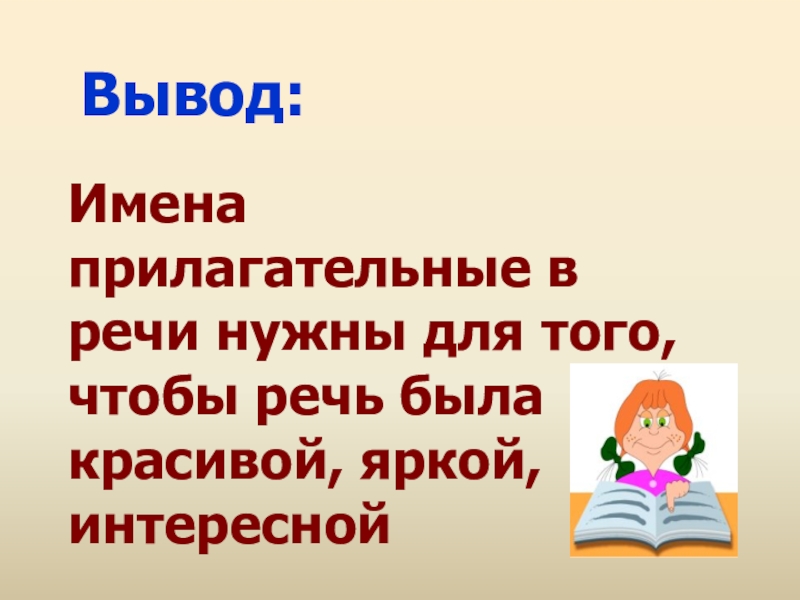 Вывод:Имена прилагательные в речи нужны для того, чтобы речь была красивой, яркой, интересной