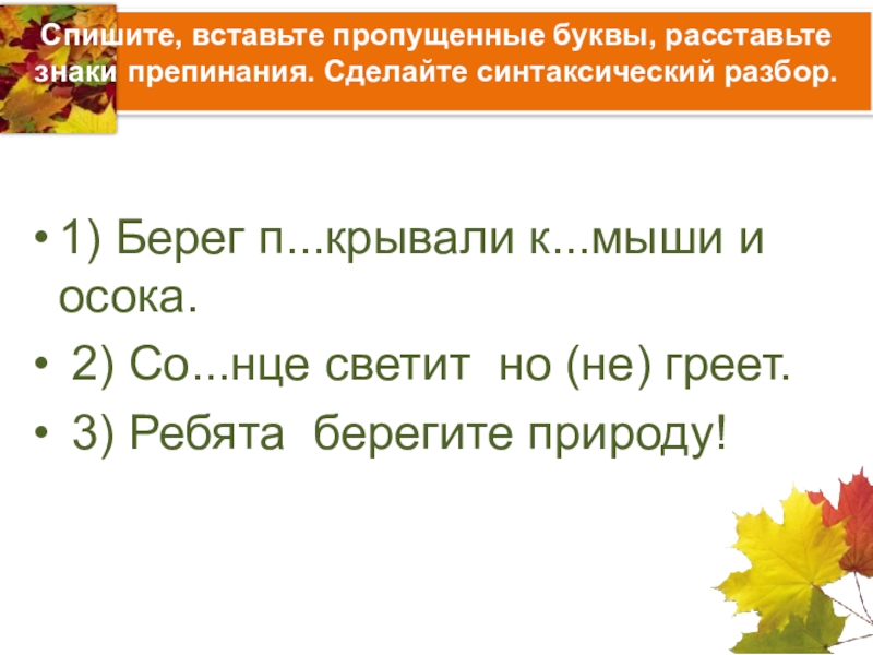 Слайд 11Спишите, вставьте пропущенные буквы, расставьте знаки препинания. Сделайте синтаксический разбор.