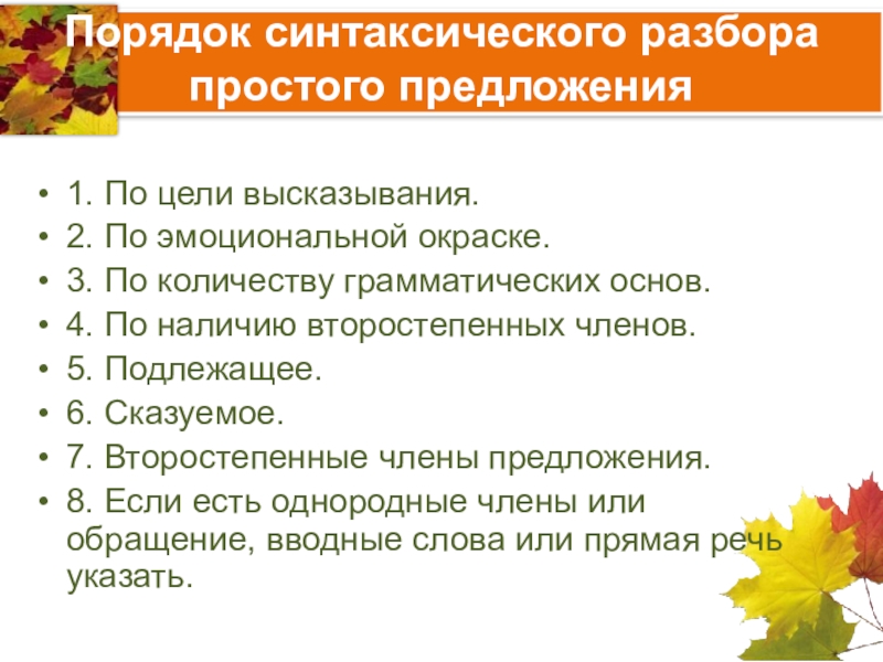 8. Если есть однородные члены или обращение, вводные слова или прямая речь указать.