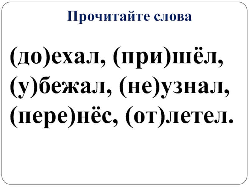 Прочитайте слова(до)ехал, (при)шёл, (у)бежал, (не)узнал, (пере)нёс, (от)летел.