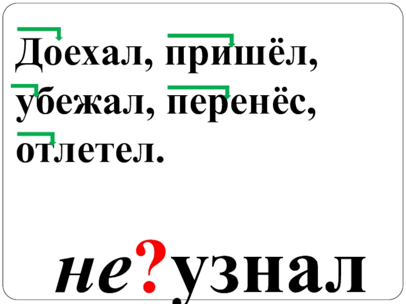 (до)ехал, (при)шёл, (у)бежал, (не)узнал,