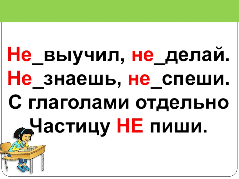 Не_выучил, не_делай.Не_знаешь, не_спеши.С глаголами отдельноЧастицу НЕ пиши.