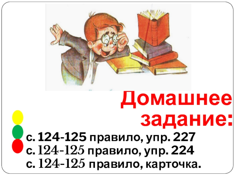 Домашнее задание:с. 124-125 правило, упр. 227с. 124-125 правило, упр. 224с. 124-125 правило, карточка.
