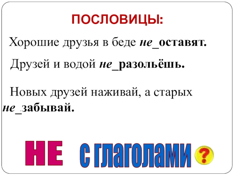 ПОСЛОВИЦЫ:НЕс глаголамиХорошие друзья в беде не_оставят. Друзей и водой не_разольёшь.  Новых друзей наживай, а старых