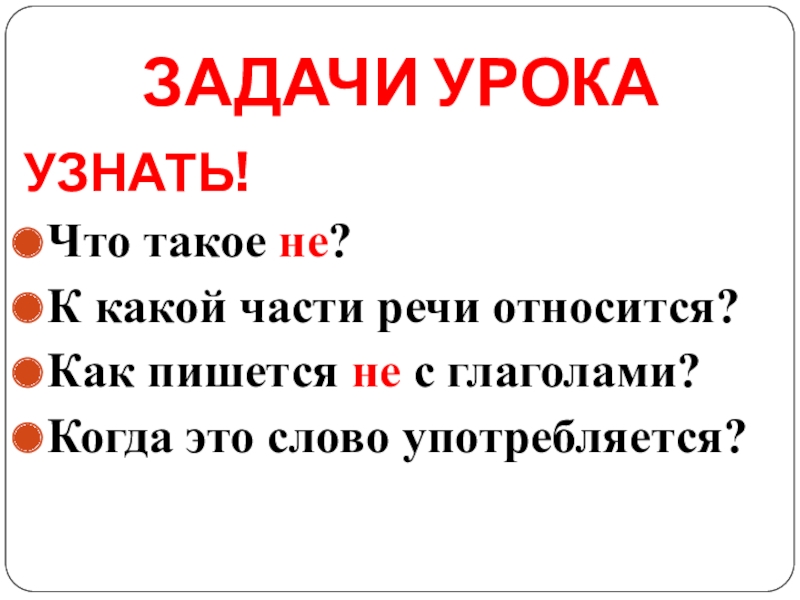 ЗАДАЧИ УРОКАУЗНАТЬ!Что такое не?К какой части речи относится? Как пишется не с глаголами?Когда это слово употребляется?