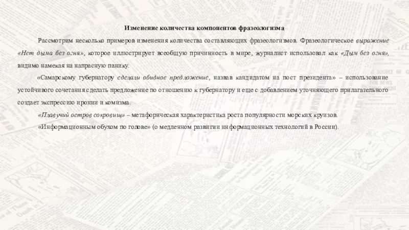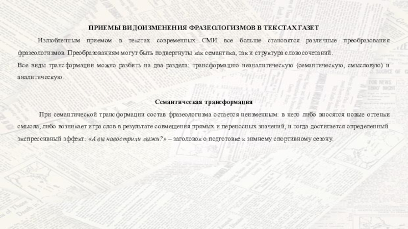 все больше становятся различные преобразования фразеологизмов. Преобразованиям могут быть подвергнуты как семантика, так и структура словосочетаний.