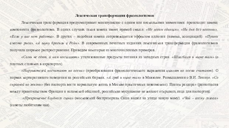 происходит замена компонента фразеологизма. В одних случаях такая замена имеет прямой смысл: «Не лесом единым», «Ни дня без песенки», «Если у вас нет работы». В других – подобная замена сопровождается эффектом аллюзии (намека, ассоциаций): «Пушки вместо риса», «А щуку бросили в Рейн». В современных печатных изданиях лексическая трансформация фразеологизмов получила широкое распространение. Приведем некоторые из многочисленных примеров.