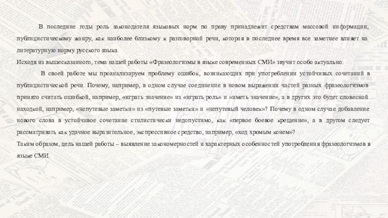 Исходя из вышесказанного, тема нашей работы «Фразеологизмы в языке современных СМИ» звучит особо актуально.