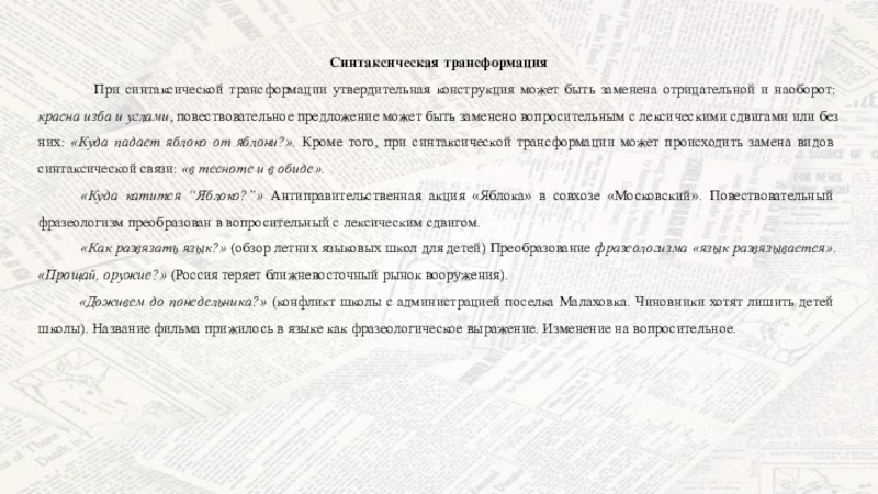 может быть заменена отрицательной и наоборот: красна изба и углами, повествовательное предложение может быть заменено вопросительным с лексическими сдвигами или без них: «Куда падает яблоко от яблони?». Кроме того, при синтаксической трансформации может происходить замена видов синтаксической связи: «в тесноте и в обиде».