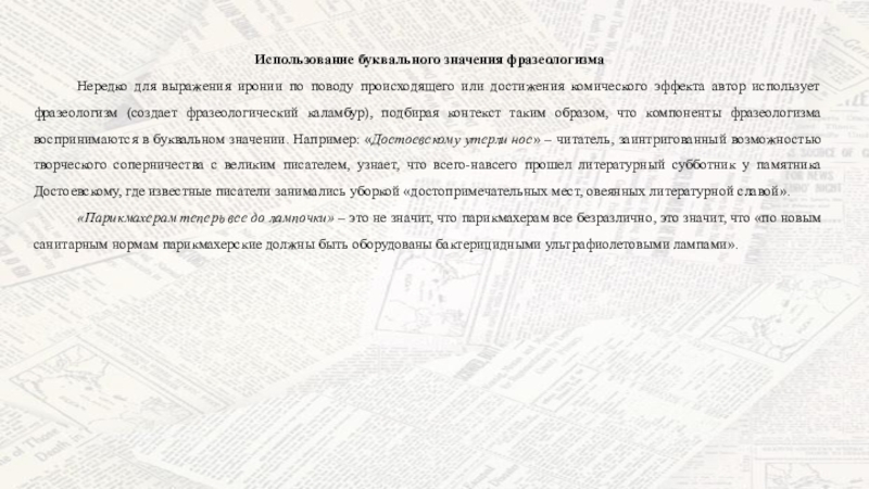 достижения комического эффекта автор использует фразеологизм (создает фразеологический каламбур), подбирая контекст таким образом, что компоненты фразеологизма воспринимаются в буквальном значении. Например: «Достоевскому утерли нос» – читатель, заинтригованный возможностью творческого соперничества с великим писателем, узнает, что всего-навсего прошел литературный субботник у памятника Достоевскому, где известные писатели занимались уборкой «достопримечательных мест, овеянных литературной славой».