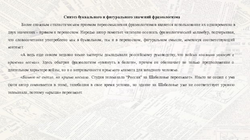 фразеологизмов является использование их одновременно в двух значениях – прямом и переносном. Нередко автор помогает читателю осознать фразеологический каламбур, подчеркивая, что словосочетание употреблено как в буквальном, так и в переносном, фигуральном смысле, компонуя соответствующий контекст.