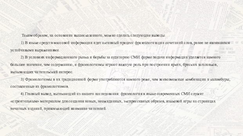 4) Главный вывод, вытекающий из нашего исследования: фразеология в языке современных СМИ служит «строительным» материалом для создания новых, неожиданных, экспрессивных образов, языковой игры на страницах печатных изданий, привлекающей внимание читателей.