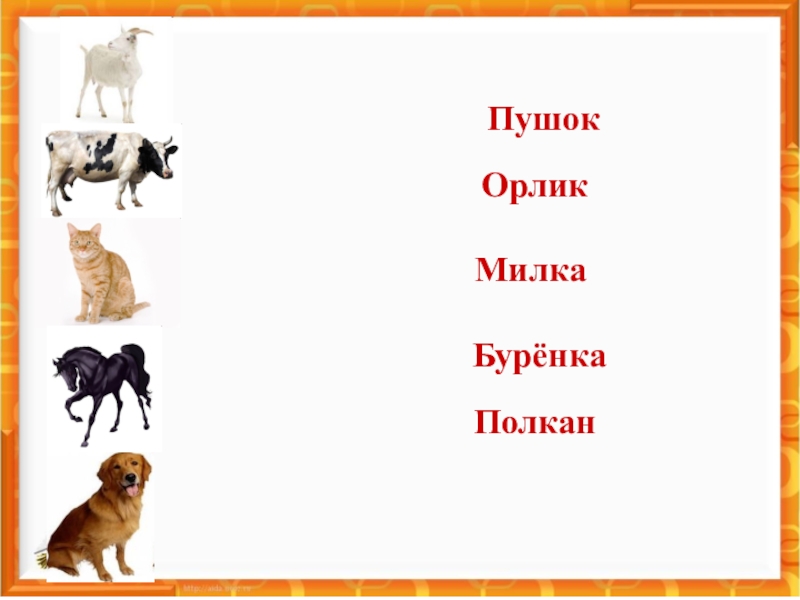 Пушок  Орлик   Милка   Бурёнка Полкан