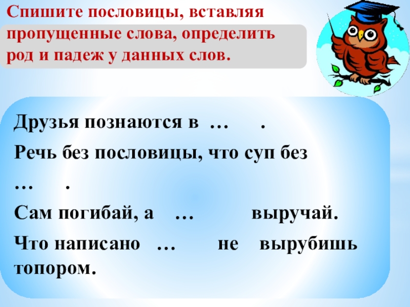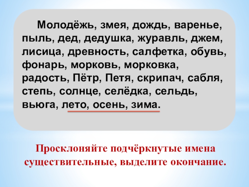 Просклоняйте подчёркнутые имена существительные, выделите окончание.