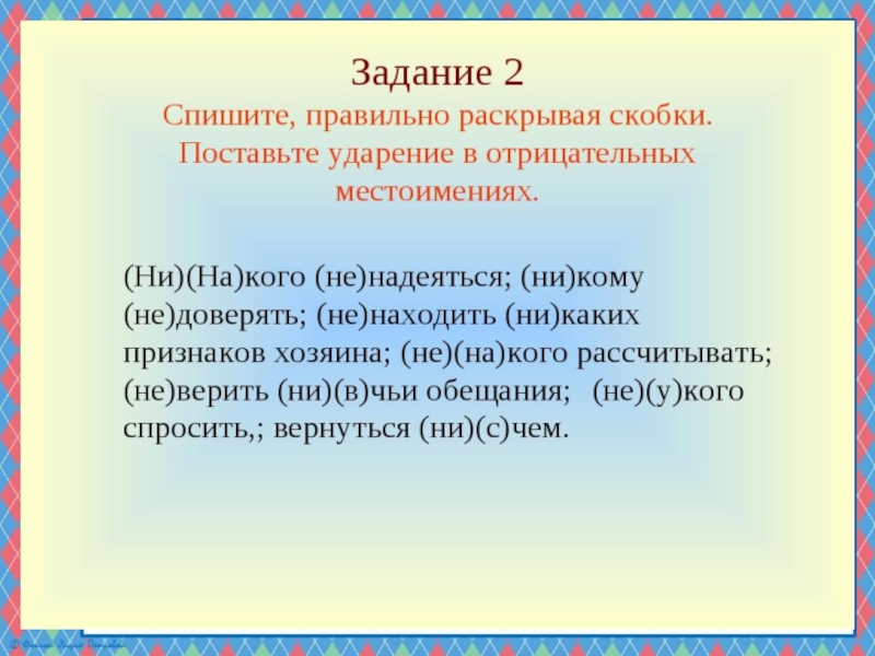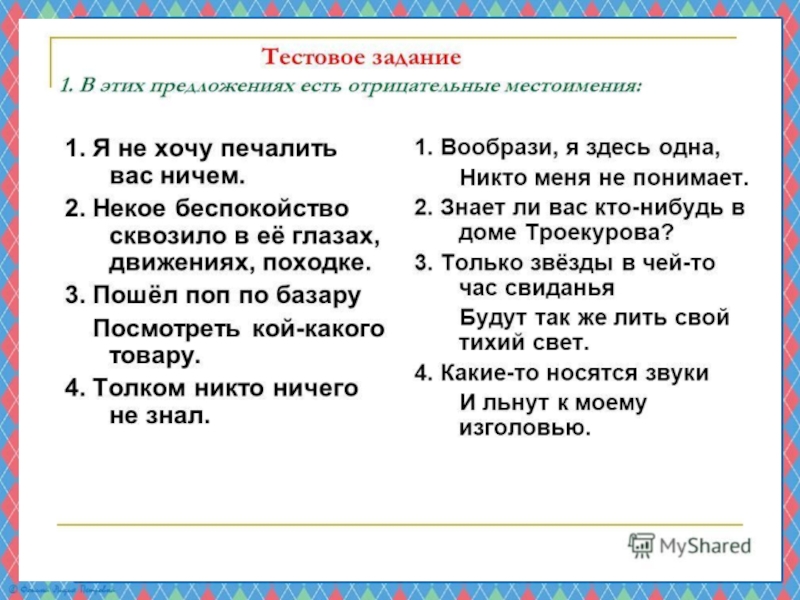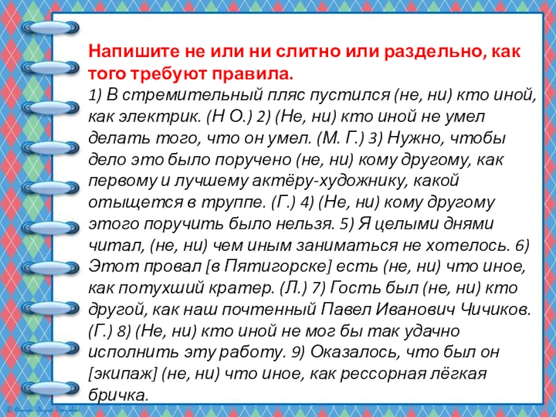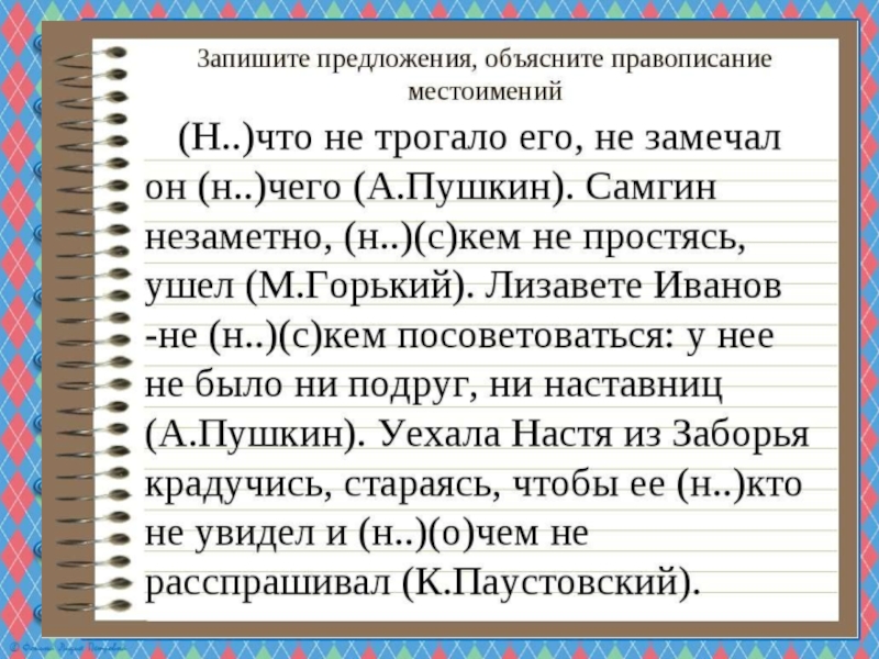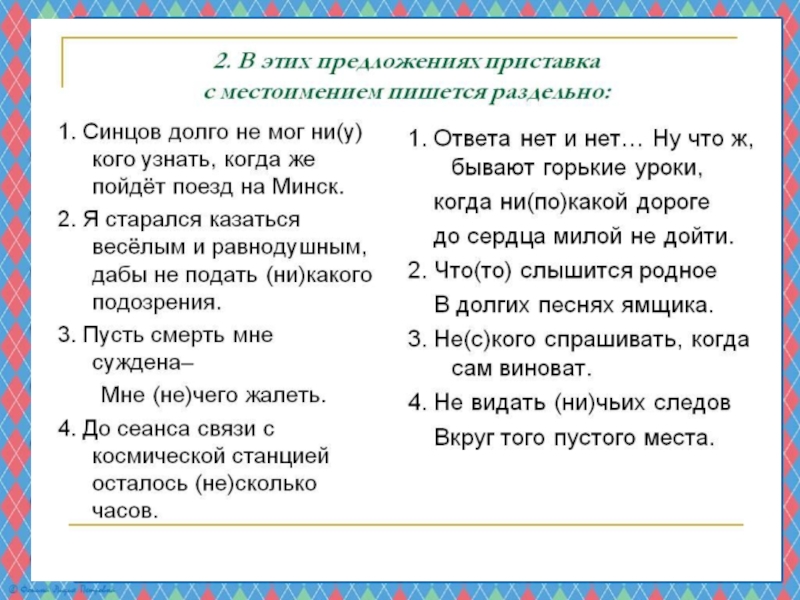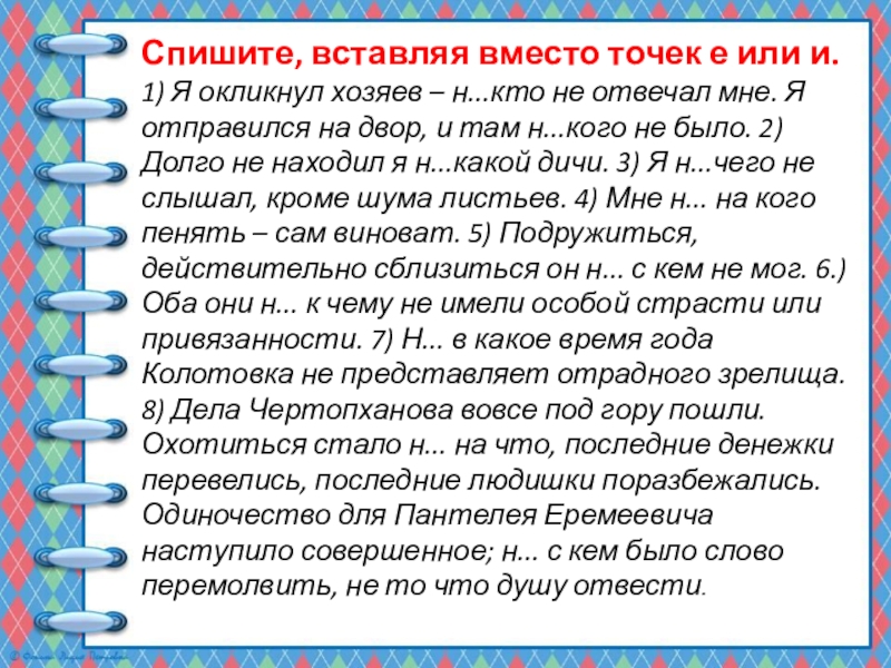 н...кто не отвечал мне. Я отправился на двор, и там н...кого не было. 2) Долго не находил я н...какой дичи. 3) Я н...чего не слышал, кроме шума листьев. 4) Мне н... на кого пенять – сам виноват. 5) Подружиться, действительно сблизиться он н... с кем не мог. 6.) Оба они н... к чему не имели особой страсти или привязанности. 7) Н... в какое время года Колотовка не представляет отрадного зрелища. 8) Дела Чертопханова вовсе под гору пошли. Охотиться стало н... на что, последние денежки перевелись, последние людишки поразбежались. Одиночество для Пантелея Еремеевича наступило совершенное; н... с кем было слово перемолвить, не то что душу отвести.