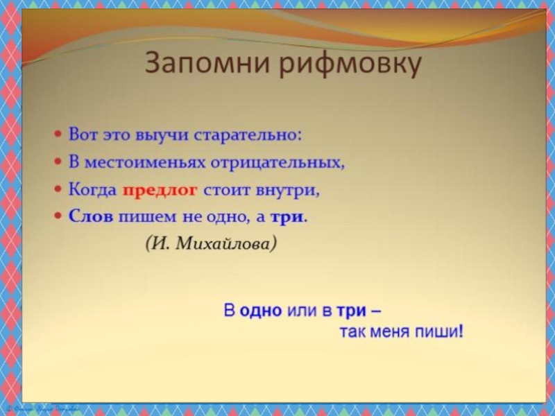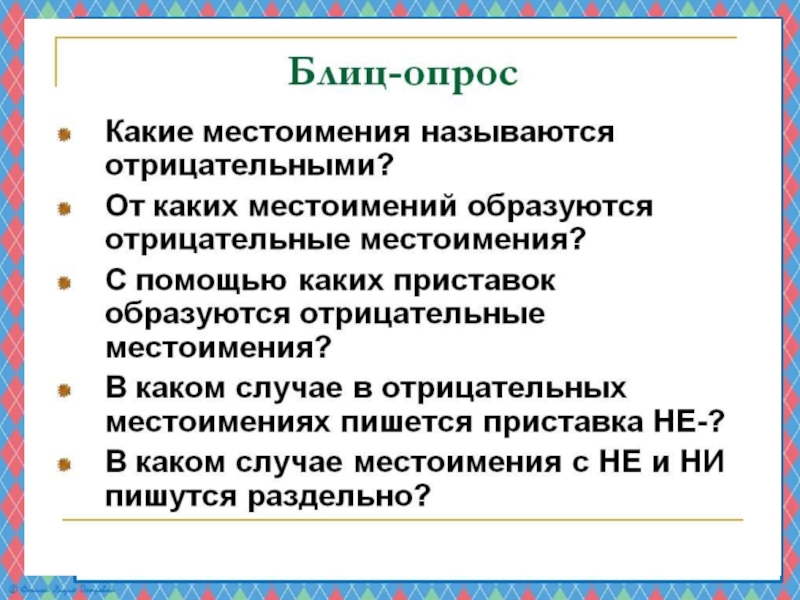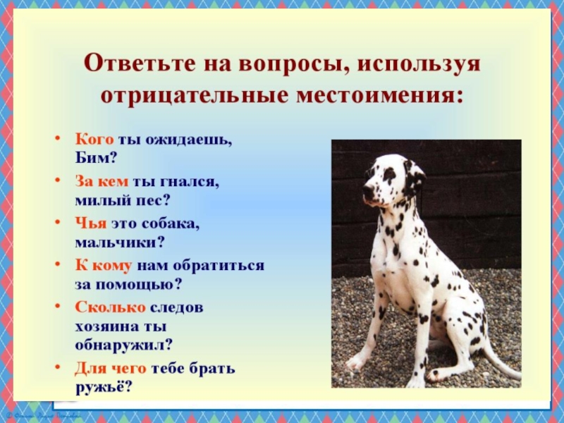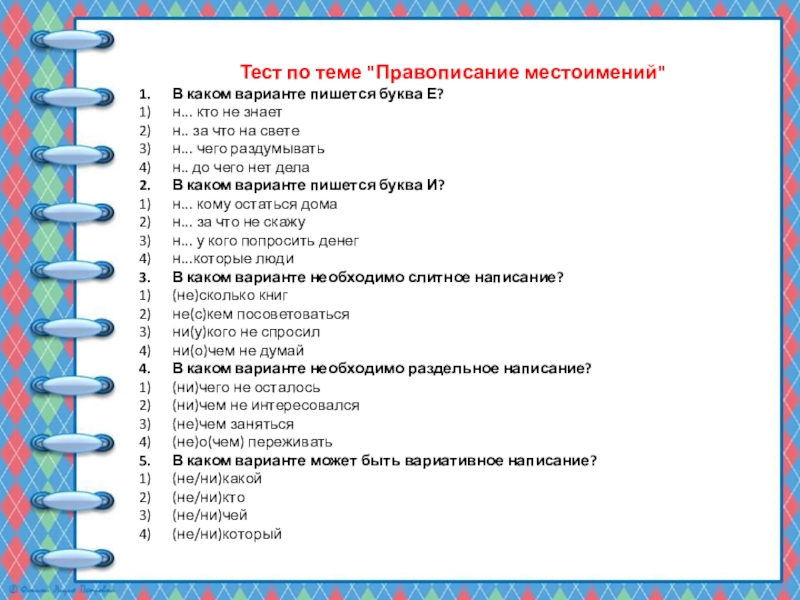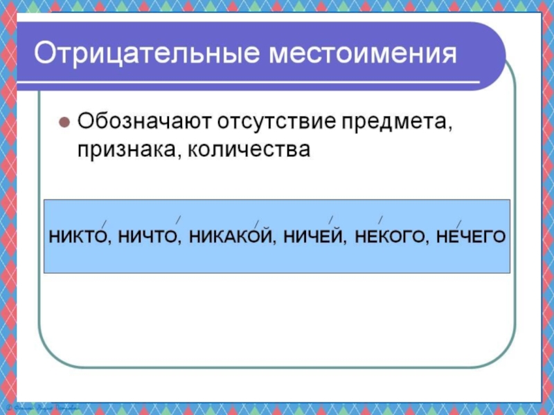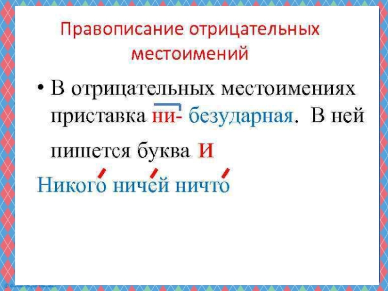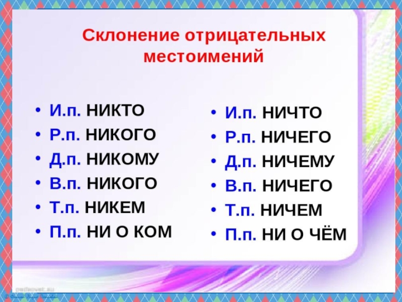 н...кто не отвечал мне. Я отправился на двор, и там н...кого не было. 2) Долго не находил я н...какой дичи. 3) Я н...чего не слышал, кроме шума листьев. 4) Мне н... на кого пенять – сам виноват. 5) Подружиться, действительно сблизиться он н... с кем не мог. 6.) Оба они н... к чему не имели особой страсти или привязанности. 7) Н... в какое время года Колотовка не представляет отрадного зрелища. 8) Дела Чертопханова вовсе под гору пошли. Охотиться стало н... на что, последние денежки перевелись, последние людишки поразбежались. Одиночество для Пантелея Еремеевича наступило совершенное; н... с кем было слово перемолвить, не то что душу отвести.