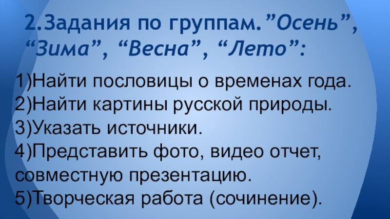 2.Задания по группам.”Осень”, “Зима”, “Весна”, “Лето”: