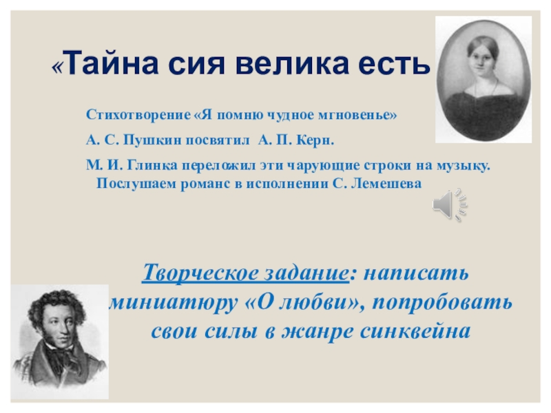 Творческое задание: написать миниатюру «О любви», попробовать свои силы в жанре синквейна