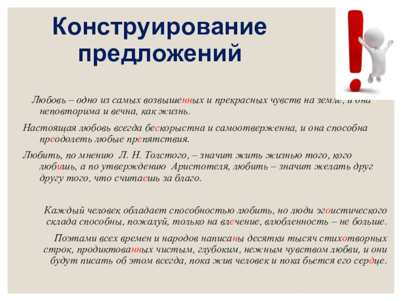 Любить, по мнению Л. Н. Толстого, – значит жить жизнью того, кого любишь, а по утверждению Аристотеля, любить – значит желать друг другу того, что считаешь за благо.