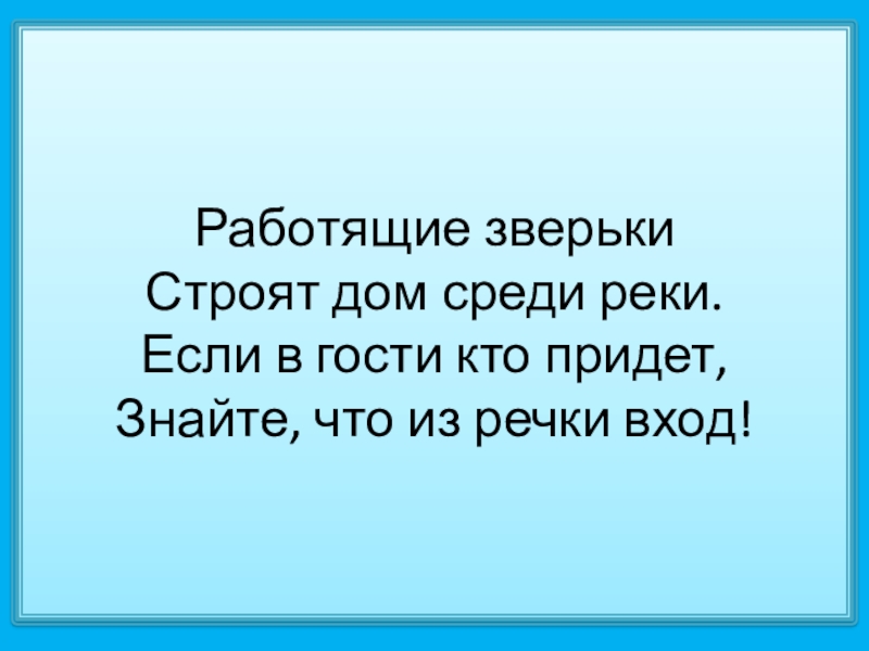 Слайд 8Работящие зверьки Строят дом среди реки. Если в гости кто придет, Знайте, что из речки вход!
