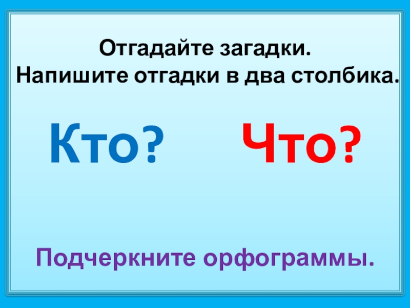 Отгадайте загадки.  Напишите отгадки в два столбика.  Кто?   Что?  Подчеркните орфограммы.