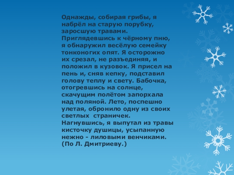 к чёрному пню, я обнаружил весёлую семейку тонконогих опят. Я осторожно их срезал, не разъединяя, и положил в кузовок. Я присел на пень и, сняв кепку, подставил голову теплу и свету. Бабочка, отогревшись на солнце, скачущим полётом запорхала над поляной. Лето, поспешно улетая, обронило одну из своих светлых страничек. Нагнувшись, я выпутал из травы кисточку душицы, усыпанную нежно - лиловыми венчиками.