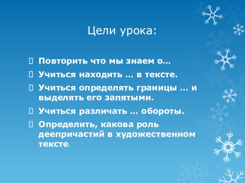 Цели урока:Повторить что мы знаем о деепричастии и деепричастном обороте.Учиться находить деепричастия и деепричастные обороты в тексте.Учиться