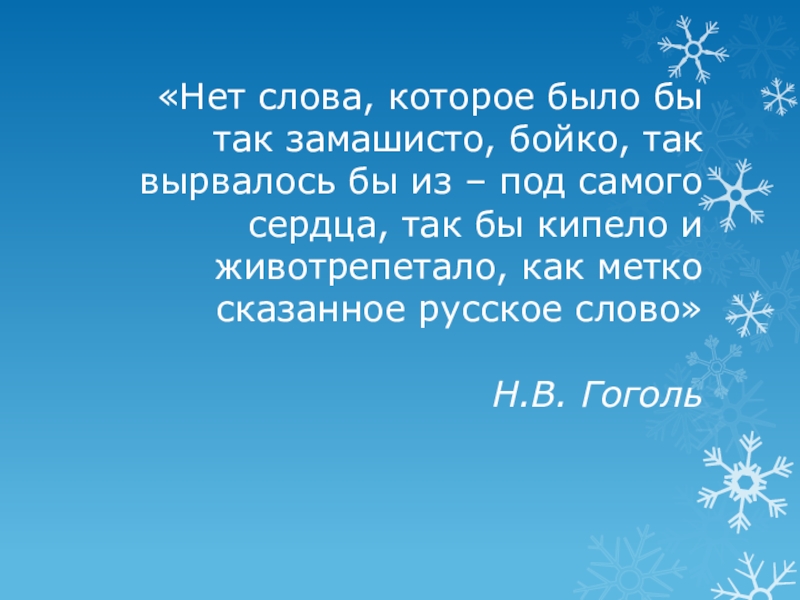 «Нет слова, которое было бы так замашисто, бойко, так вырвалось бы из – под самого сердца, так бы кипело и животрепетало, как метко сказанное русское слово» Н.В. Гоголь