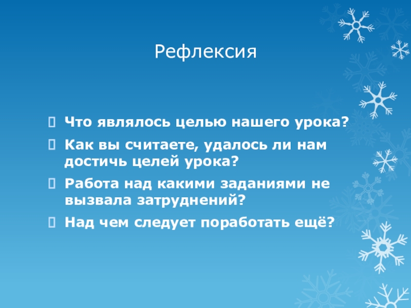 РефлексияЧто являлось целью нашего урока?Как вы считаете, удалось ли нам достичь целей урока?Работа над какими заданиями не