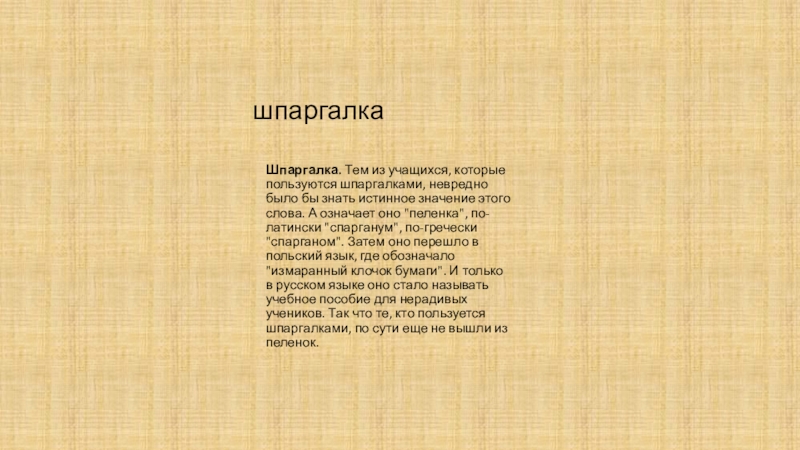 истинное значение этого слова. А означает оно "пеленка", по-латински "спарганум", по-гречески "спарганом". Затем оно перешло в польский язык, где обозначало "измаранный клочок бумаги". И только в русском языке оно стало называть учебное пособие для нерадивых учеников. Так что те, кто пользуется шпаргалками, по сути еще не вышли из пеленок.