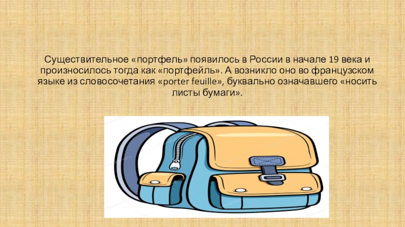 Слайд 9Существительное «портфель» появилось в России в начале 19 века и произносилось