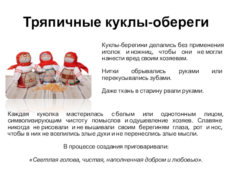 Каждая куколка мастерилась с белым или однотонным лицом, символизирующим чистоту помыслов и одушевление хозяев. Славяне никогда не рисовали и не вышивали своим берегиням глаза, рот и нос, чтобы в них не вселились злые духи и не перенеслись злые мысли.