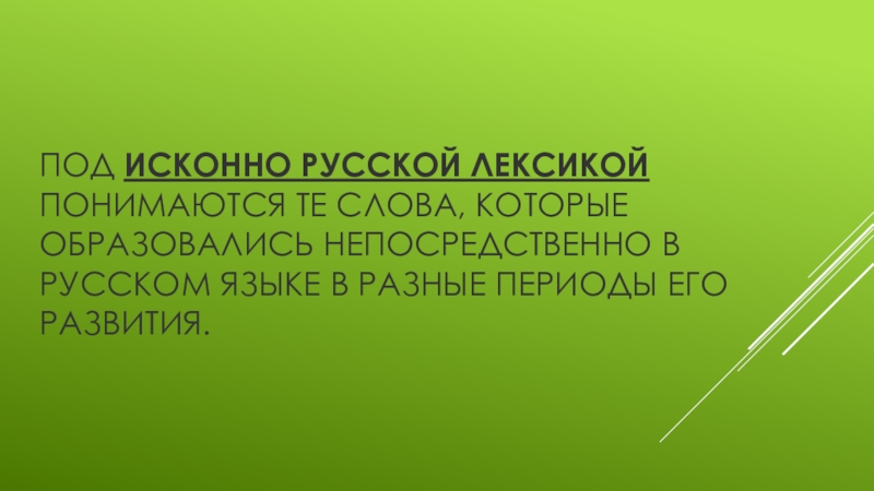 Слайд 20Под исконно русской лексикой понимаются те слова, которые образовались непосредственно в