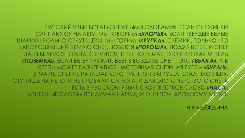 Слайд 3Русский язык богат «снежными словами». Если снежинки слипаются на лету, мы