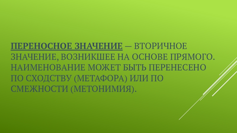 Слайд 12Переносное значение — вторичное значение, возникшее на основе прямого. Наименование может быть
