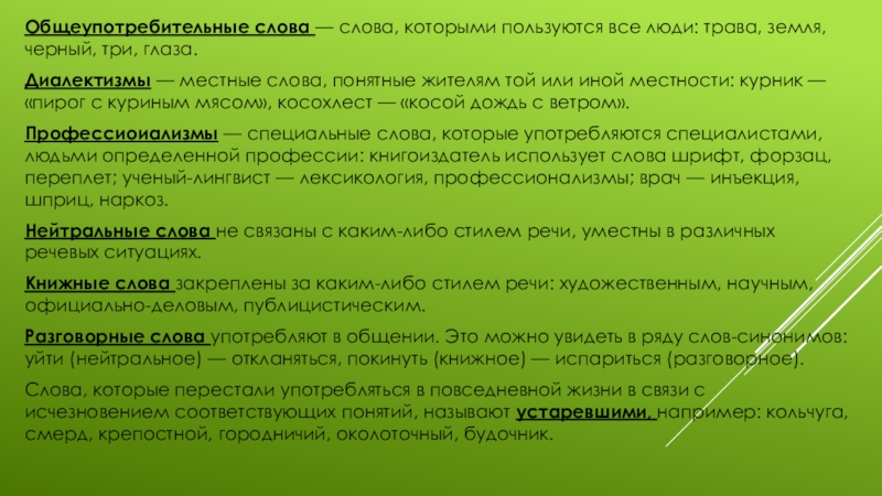 Слайд 18Общеупотребительные слова — слова, которыми пользуются все люди: трава, земля, черный,