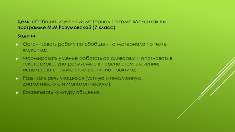 Слайд 2Цель: обобщить изученный материал по теме «Лексика» по программе М.М.Разумовской (7 класс).
